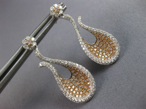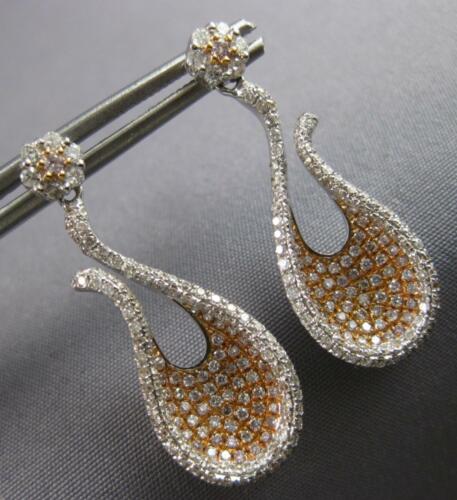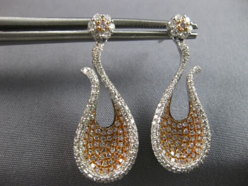 LARGE 18KT WHITE AND ROSE GOLD FUN HANGING EARRINGS. 3D FLOWER TEAR DROP DESIGN. WHITE DIAMONDS ARE F/G COLOR, VSSI CLARITY .88 CARATS. PINK DIAMONDS ARE .46 CARATS. MEASURES 20mm X 12mm. WRITTEN APPRAISAL AVAILABLE. COMES IN A PRESENTABLE GIFT BOX.