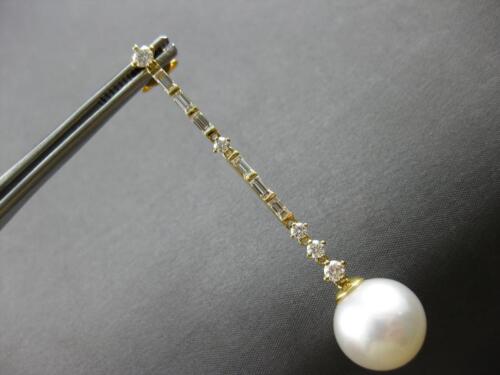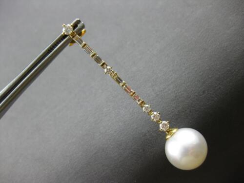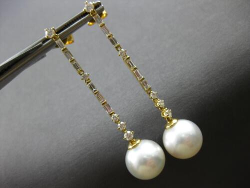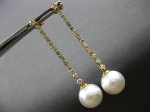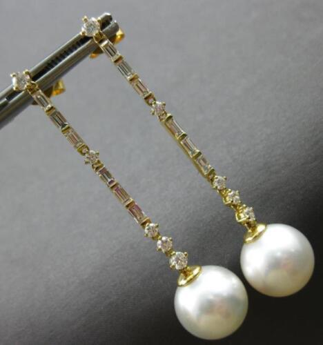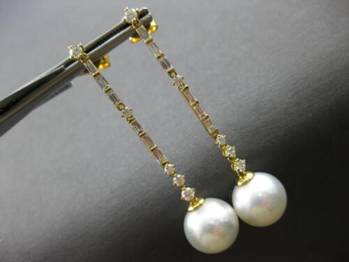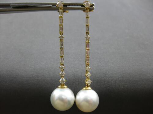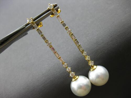 LARGE 18KT YELLOW GOLD HANGING EARRINGS. 3D CLASSIC DESIGN. DIAMONDS ARE F/G COLOR, VSSI CLARITY. ROUND DIAMONDS ARE .59 CARATS. BAGUETTE DIAMONDS ARE .78 CARATS. FEATURES AAA SOUTH SEA PEARLS. PEARLS MEASURE 12mm WIDE. EARRINGS MEASURE 53mm X 12mm. WRITTEN APPRAISAL AVAILABLE. COMES IN A PRESENTABLE GIFT BOX.