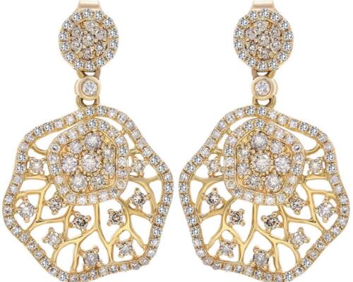 LARGE 14KT YELLOW GOLD FUN HANGING EARRINGS. 3D FLORAL OPEN FILIGREE DESIGN. WHITE DIAMONDS ARE F/G COLOR, VSSI CLARITY .67 CARATS. CHOCOLATE FANCY DIAMONDS ARE .70 CARATS. WRITTEN APPRAISAL AVAILABLE. COMES IN A PRESENTABLE GIFT BOX.