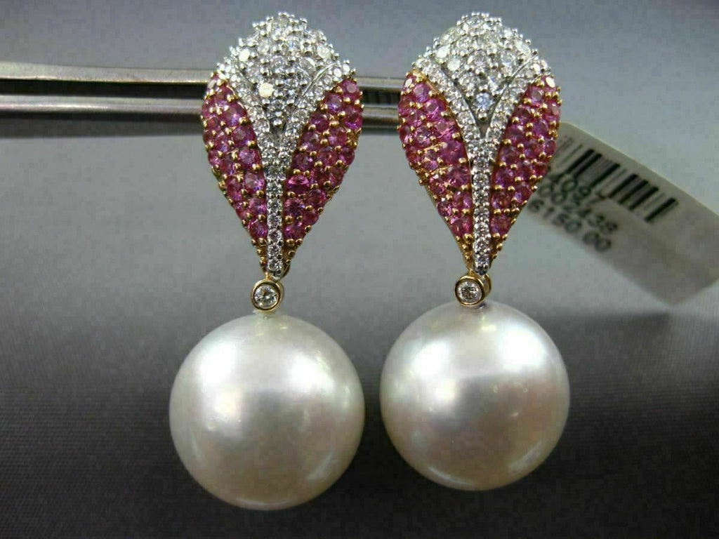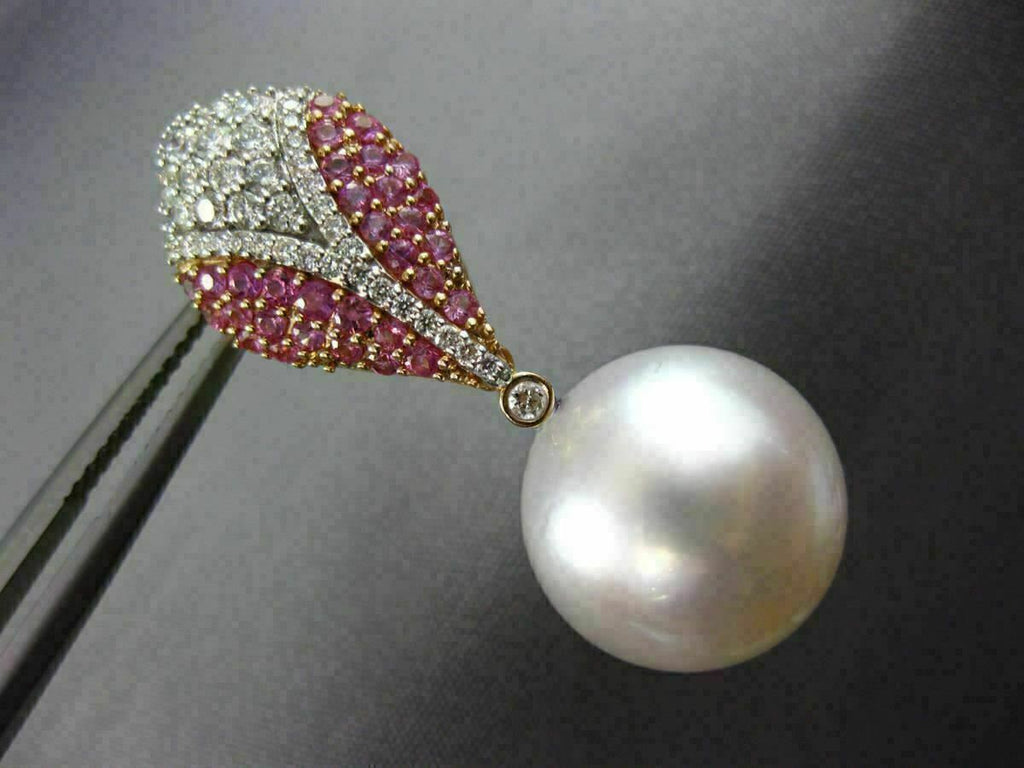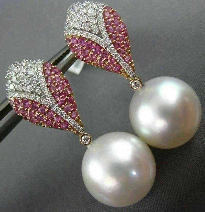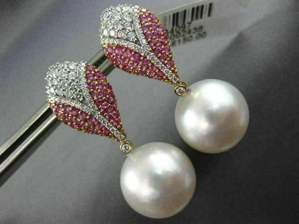 LARGE 14KT WHITE AND ROSE GOLD HANGING EARRINGS. 3D TEAR DROP DESIGN. DIAMONDS ARE F/G COLOR, VSSI CLARITY .63 CARATS. AAA PINK SAPPHIRE ARE .83 CARATS. FEATURES AAA SOUTH SEA PEARL. MEASURES 34MM X 14MM. WRITTEN APPRAISAL AVAILABLE. COMES IN A PRESENTABLE GIFT BOX