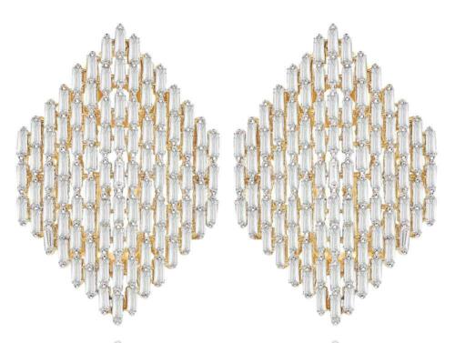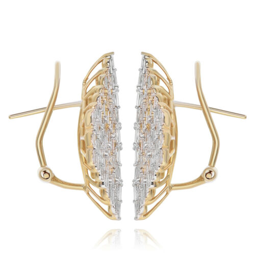 LARGE 14KT YELLOW GOLD CLIP ON HANGING EARRINGS. 3D HEXAGON DESIGN. BAGUETTE DIAMONDS ARE F/G COLOR, VSSI CLARITY 1.48 CARATS. WRITTEN APPRAISAL AVAILABLE. COMES IN A PRESENTABLE GIFT BOX.