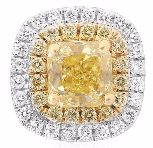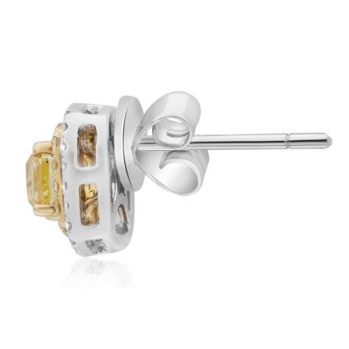 ESTATE LARGE 14KT WHITE AND YELLOW GOLD STUD EARRINGS. 3D SQUARE DOUBLE HALO DESIGN. DIAMONDS ARE F/G COLOR, VSSI CLARITY .17 CARATS. FANCY YELLOW DIAMONDS ARE 1.38 CARATS  MEASURES 9mm WIDE. WRITTEN APPRAISAL AVAILABLE. COMES IN A PRESENTABLE GIFT BOX.