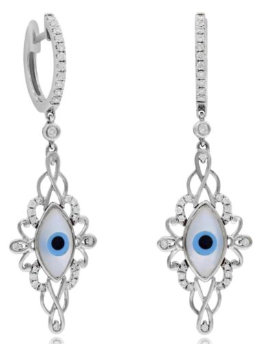 LARGE 14KT WHITE GOLD FUN HANGING EARRINGS. 3D FLORAL FILIGREE LUCKY EVIL EYE INSIDE OUT DESIGN. ROUND DIAMONDS ARE F/G COLOR, VSSI CLARITY .37 CARATS. AAA MOTHER OF PEARLS ARE 1.42 CARATS. WRITTEN APPRAISAL AVAILABLE. COMES IN A PRESENTABLE GIFT BOX.