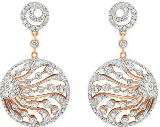 LARGE 14KT ROSEGOLD FUN HANGINGEARRINGS. 3D CIRCULAR FLOWER ETOILEDESIGN. DIAMONDS ARE F/G COLOR, VSSI CLARITY 1.97CARATS.WRITTEN APPRAISAL AVAILABLE. COMES IN A PRESENTABLE GIFT BOX.