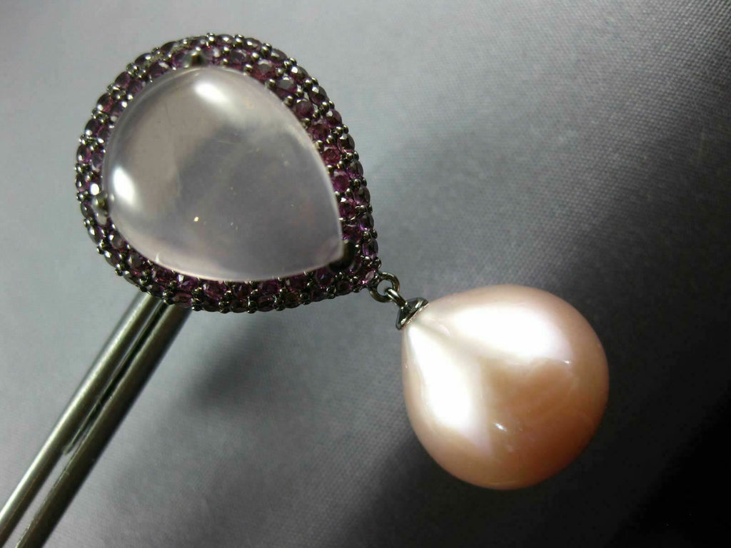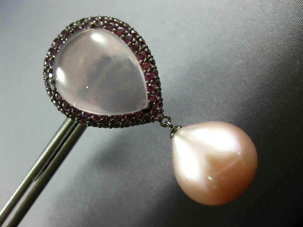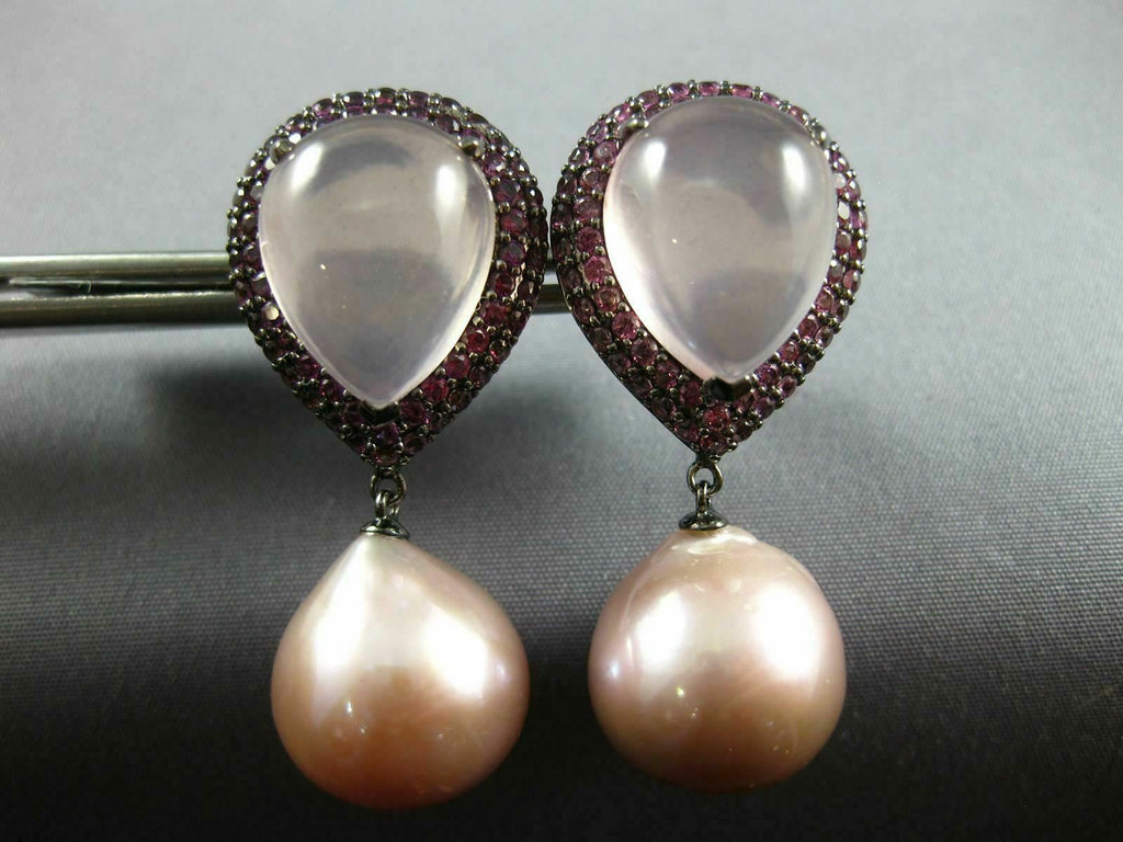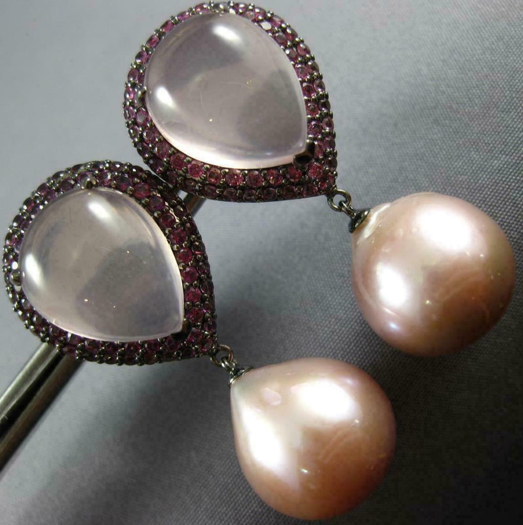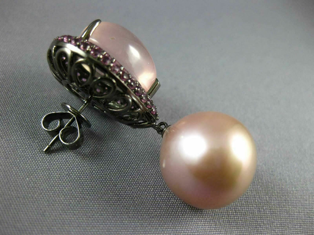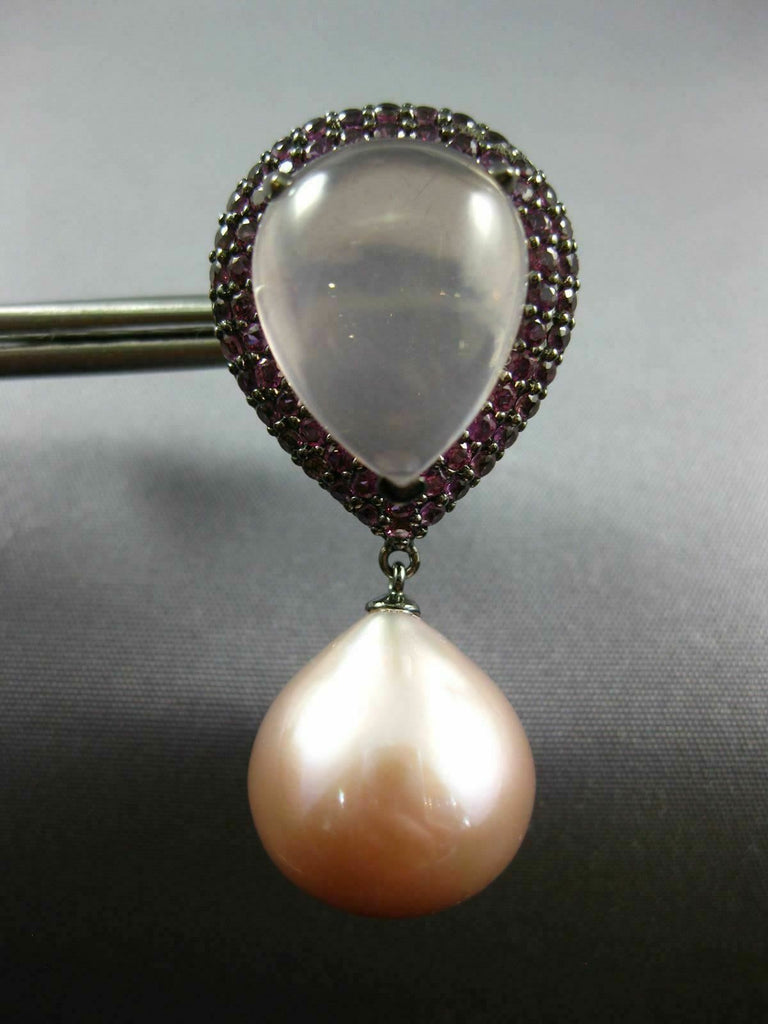 LARGE18KT BLACK GOLD HANGING EARRINGS. 3D TEAR DROPDESIGN. AAA PINK SAPPHIRES ARE 2.20 CARATS. AAA PINK QUARTZ ARE 10.0 CARATS. FEATURES AAA PINK SOUTH SEA PEARLS.MEASURES 40mm X 18mm. WRITTEN APPRAISAL AVAILABLE. COMES IN A PRESENTABLE GIFT BOX.