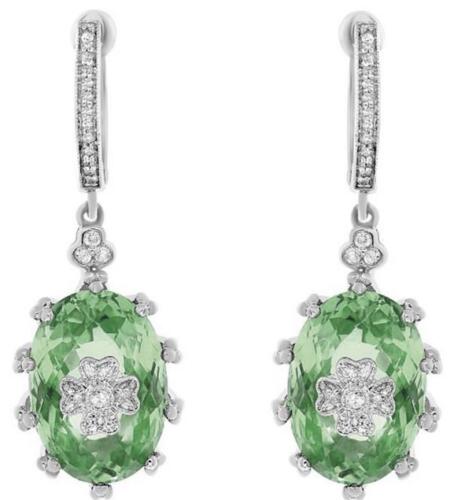 LARGE 14KT WHITE GOLD FUN HANGING EARRINGS. 3D OVAL FLOWER FILIGREE DESIGN. ROUND DIAMONDS ARE F/G COLOR, VSSI CLARITY .16 CARATS. AAA EXTRA FACETED OVAL GREEN AMETHYSTS ARE 10.92 CARATS.