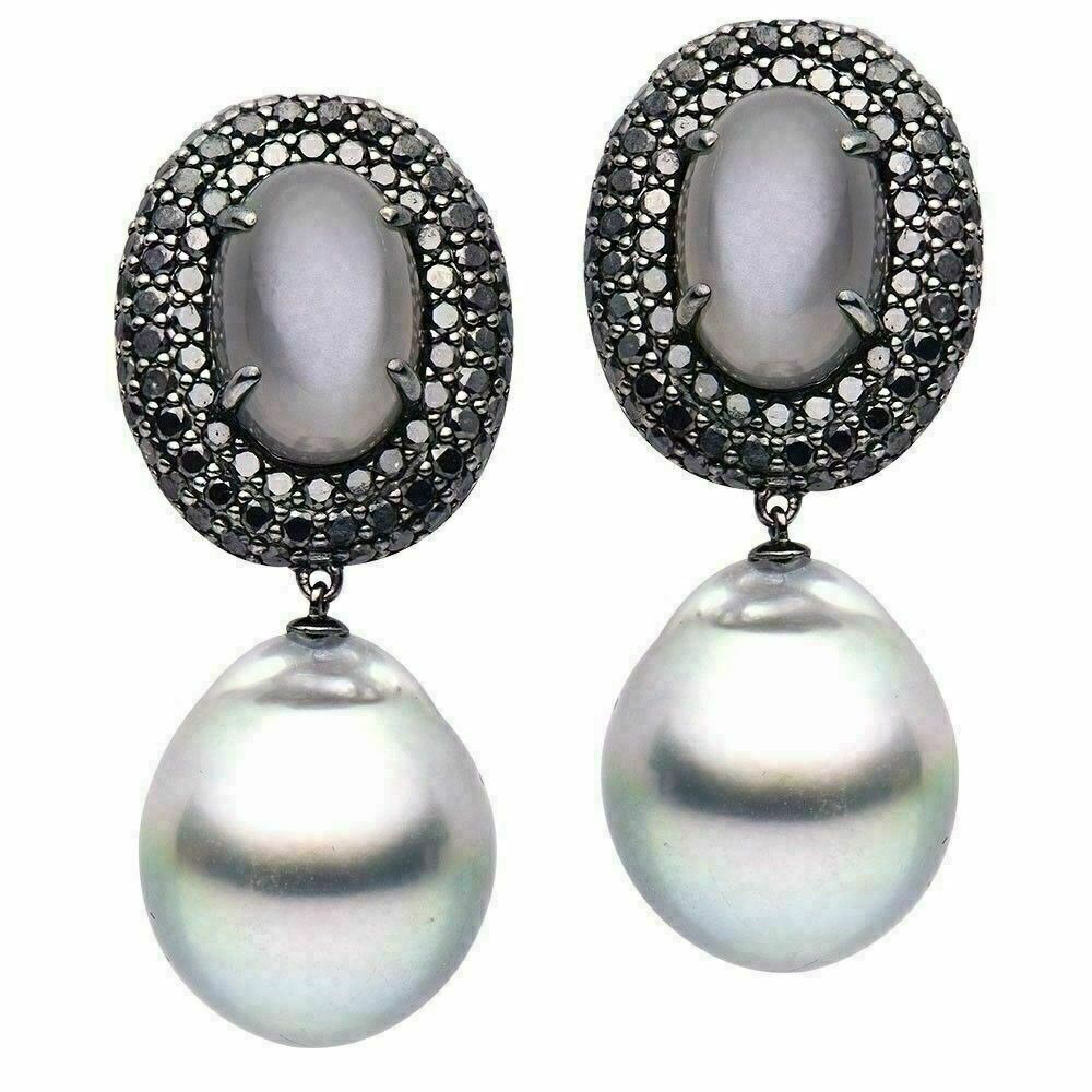 LARGE 18KT BLACK GOLD HANGINGEARRINGS. 3D OVAL PAVE DESIGN. AAA CABOCHONGREY MOON STONE ARE 8.0CARATS. BLACK DIAMONDS ARE 3.0CARATS. FEATURES AAA PEARL. WRITTEN APPRAISAL AVAILABLE. COMES IN A PRESENTABLE GIFT BOX.