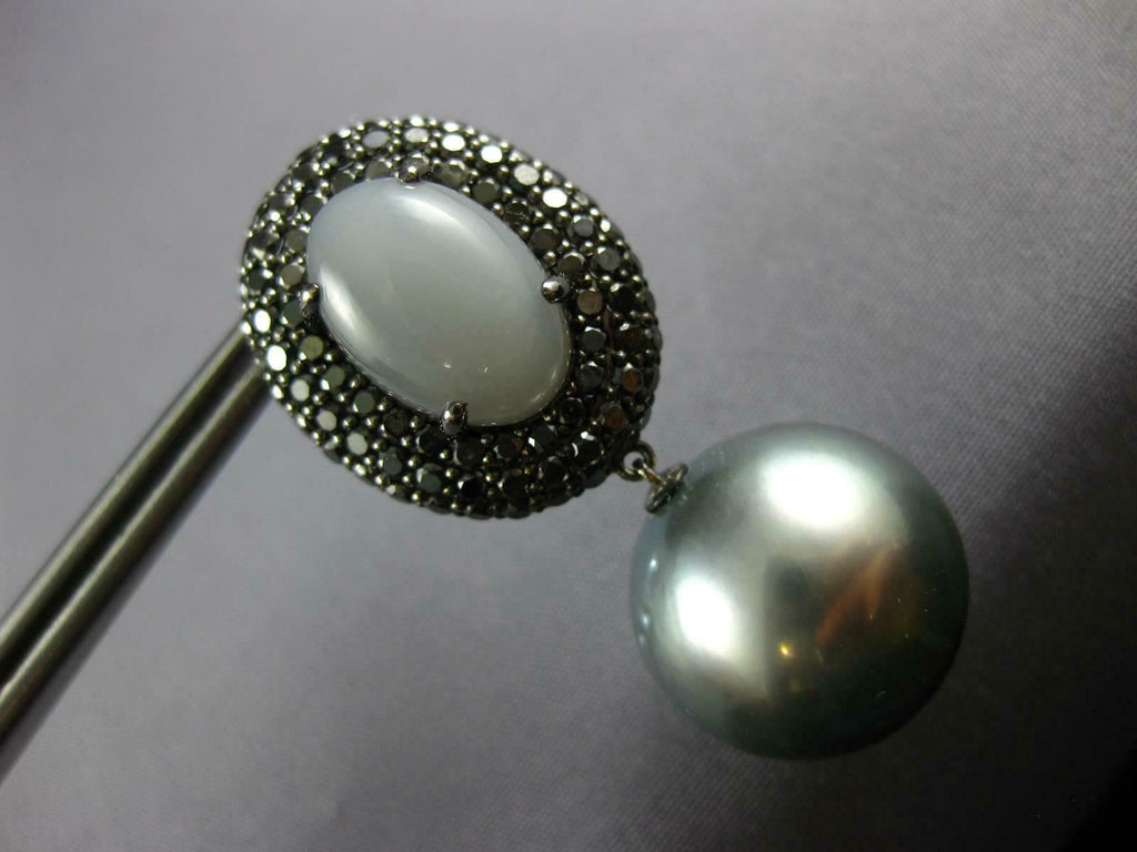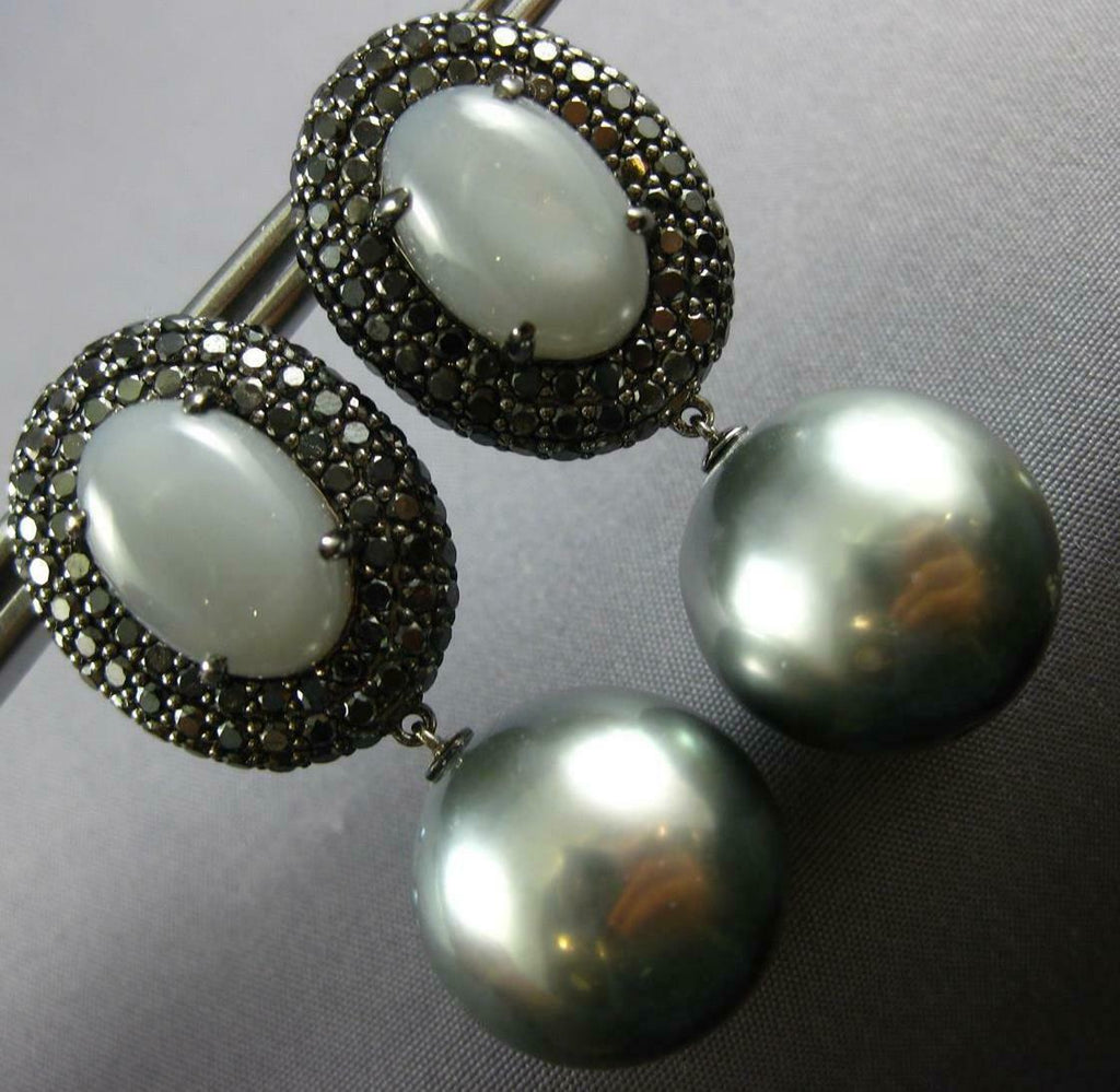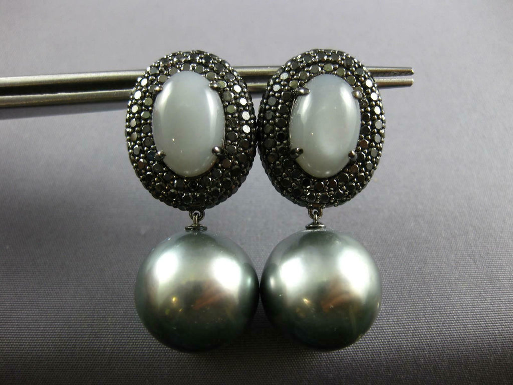 LARGE 11CT DIAMOND & MOON STONE & TAHITIAN PEARL 18K BLACK GOLD HANGING EARRINGS
