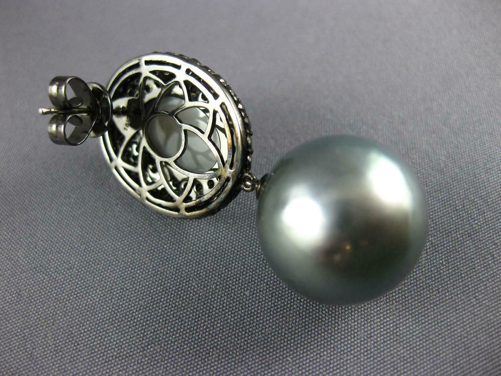 LARGE18KT BLACKGOLD HANGING EARRINGS. 3D CLASSIC OVAL DESIGN. DIAMONDS ARE F/G COLOR, VSSI CLARITY 3.0CARATS. MOON STONES ARE 8.0 CARATS. FEATURES AAA TAHITIAN PEARLS.MEASURES 40mm X 17mm. WRITTEN APPRAISAL AVAILABLE. COMES IN A PRESENTABLE GIFT BOX.