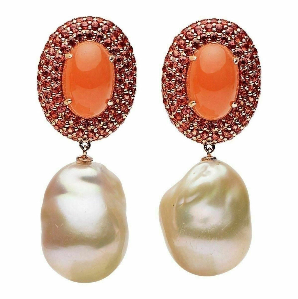 LARGE 12.0CT AAA ORANGE MOON & SAPPHIRE & PEARL 18KT ROSE GOLD EARRINGS