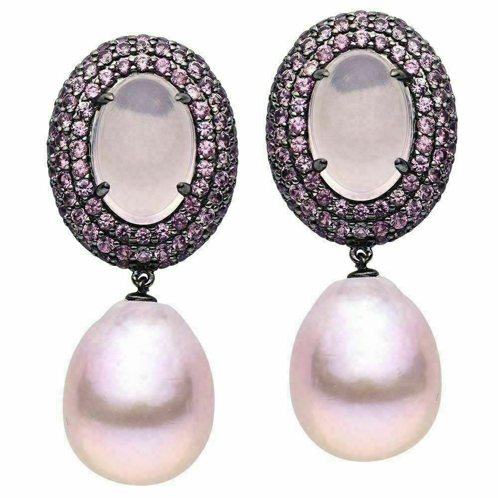 LARGE 18KT BLACK GOLD HANGINGEARRINGS. 3D OVAL PAVE DESIGN. AAACABOCHON ROSE QUARTZARE 8.0CARATS. AAA PINK SAPPHIRES ARE 4.0 CARATS. AAA SOUTH SEAPEARLS. WRITTEN APPRAISAL AVAILABLE. COMES IN A PRESENTABLE GIFT BOX.
