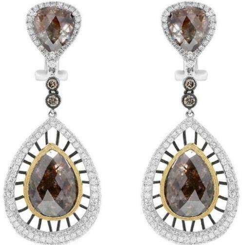 LARGE 13.24CT WHITE & MOCHA DIAMOND 18KT WHITE GOLD TEAR DROP HANGING EARRINGS