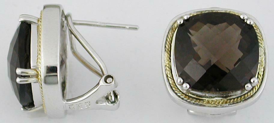 LARGE 14KT YELLOW GOLD AND 925 STERLING SILVER CLIP ON EARRINGS. 3D CLASSIC SQUARE DESIGN. AAA EXTRA FACETED SMOKEY TOPAZ ARE 13.50 CARATS. WRITTEN APPRAISAL AVAILABLE. COMES IN A PRESENTABLE GIFT BOX.