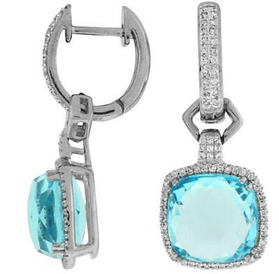 LARGE 14KT WHITE GOLD HUGGIE HANGING EARRINGS. 3D HALO DESIGN. ROUND DIAMONDS ARE F/G COLOR, VSSI CLARITY .35 CARATS. AAA EXTRA FACETED CUSHION CUT BLUE TOPAZ ARE 13.40 CARATS. WRITTEN APPRAISAL AVAILABLE. COMES IN A PRESENTABLE GIFT BOX.