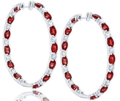 LARGE 18KT WHITE GOLD HOOP HANGING EARRINGS. 3D INSIDE OUT DESIGN. ROUND DIAMONDS ARE G/H COLOR, VSSI CLARITY 3.16 CARATS. AAA OVAL RUBIES ARE 10.66 CARATS. WRITTEN APPRAISAL AVAILABLE. COMES IN A PRESENTABLE GIFT BOX.