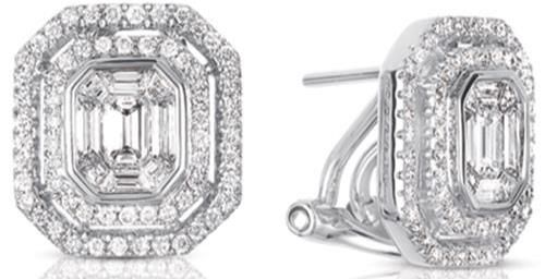 LARGE 14KT WHITE GOLD CLIP ON EARRINGS. 3D INVISIBLE BEZEL DOUBLE HALO OCTAGON DESIGN. DIAMONDS ARE F/G COLOR, VSSI CLARITY. ROUND DIAMONDS ARE .53 CARATS. EMERALD CUT DIAMOND IS .37 CARATS. BAGUETTE CUT DIAMONDS ARE .45 CARATS. MEASURES 13mm WIDE. WRITTEN APPRAISAL AVAILABLE. COMES IN A PRESENTABLE GIFT BOX.