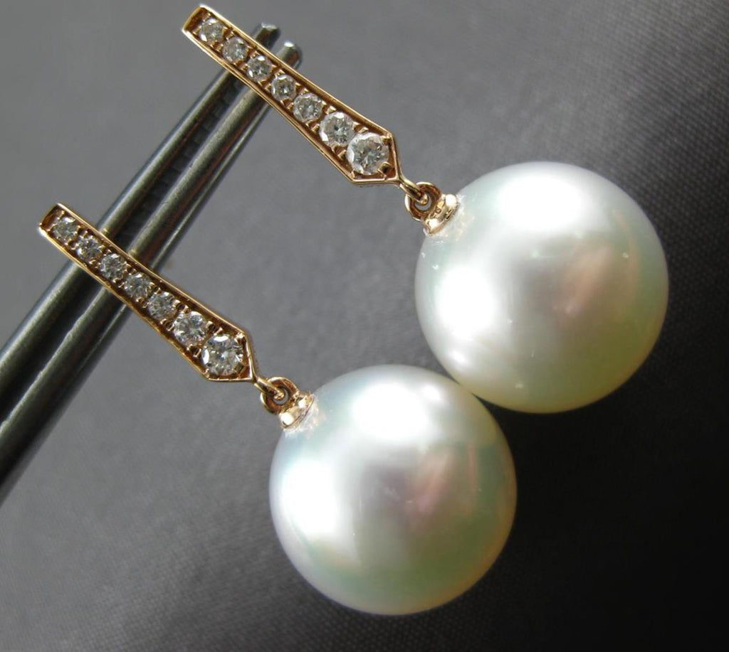 LARGE 18KT ROSE GOLD HANGING EARRINGS. 3D JOURNEY BAR DESIGN. DIAMONDS ARE F/G COLOR, VSSI CLARITY .16 CARATS. FEATURES 11.5mm WIDE AAA SOUTH SEA PEARLS. EARRINGS MEASURES 26mm X 11.5mm. WRITTEN APPRAISAL AVAILABLE. COMES IN A PRESENTABLE GIFT BOX.