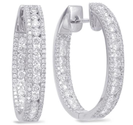 LARGE 14KT WHITE GOLD HOOP HANGING EARRINGS. 3D CLASSIC INSIDE OUT THREE ROW DESIGN. ROUND DIAMONDS ARE F/G COLOR, VSSI CLARITY 1.79 CARATS. MEASURES 4mm WIDE. WRITTEN APPRAISAL AVAILABLE. COMES IN A PRESENTABLE GIFT BOX.