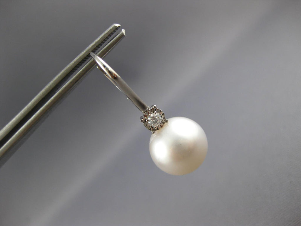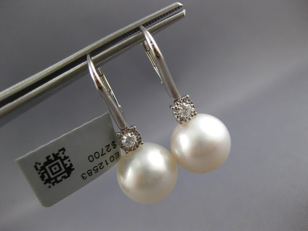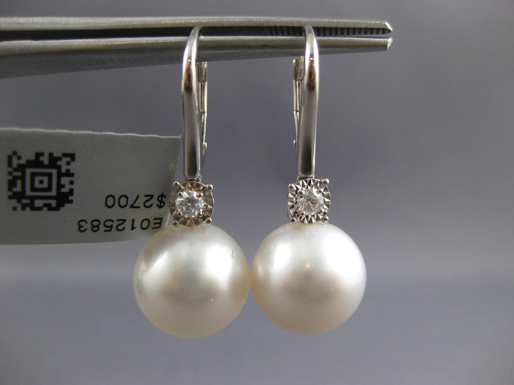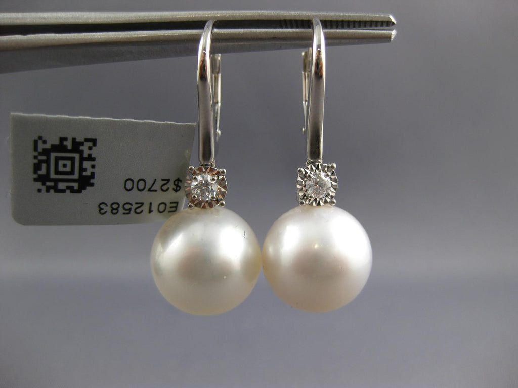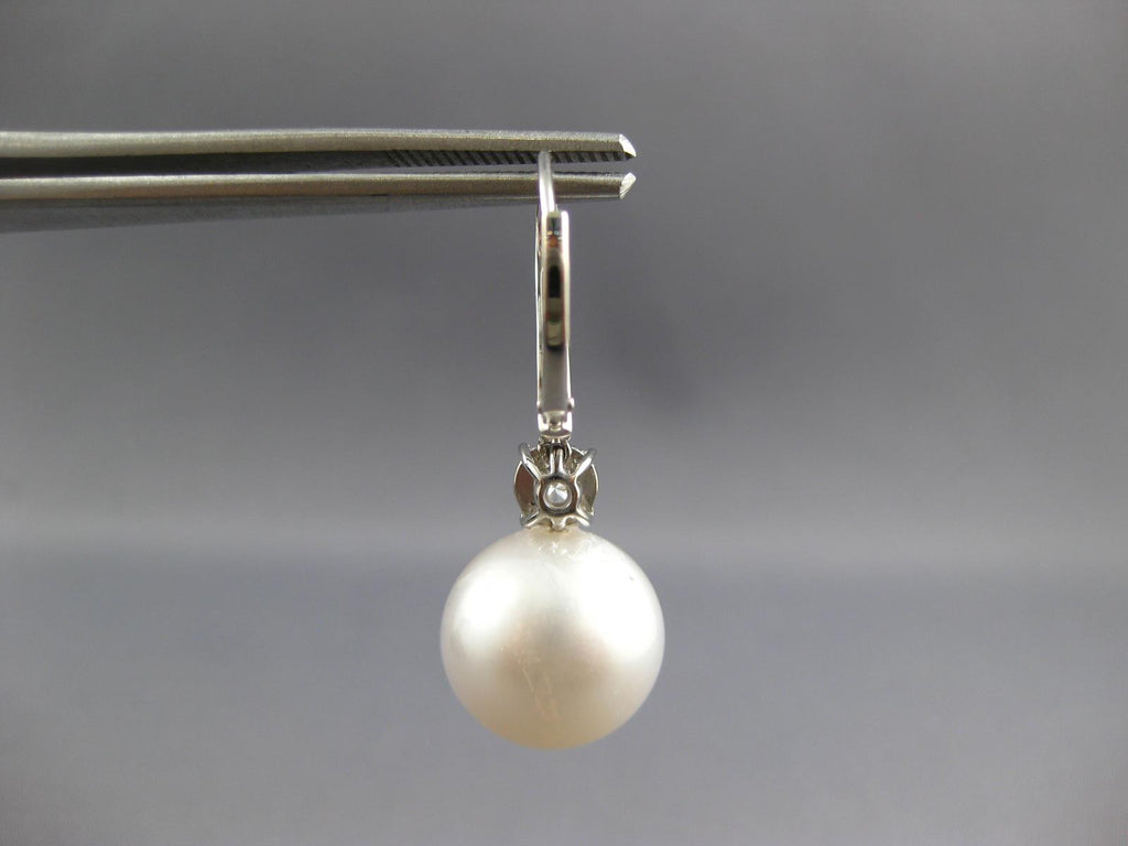 LARGE 18KT WHITE GOLD LEVERBACK HANGING EARRINGS. 3D CLASSIC DESIGN. DIAMONDS ARE F/G COLOR, VSSI CLARITY .17 CARATS. FEATURES 13mm WIDE AAA SOUTH SEA PEARL. EARRINGS MEASURES 33mm X 13mm. WRITTEN APPRAISAL AVAILABLE. COMES IN A PRESENTABLE GIFT BOX.