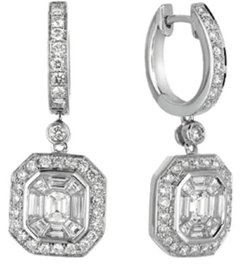 LARGE 14KT WHITE GOLD CLIP ON HANGING EARRINGS. 3D INVISIBLE BEZEL HALO OCTAGON DESIGN. DIAMONDS ARE F/G COLOR, VSSI CLARITY. ROUND DIAMONDS ARE .74 CARATS. EMERALD CUT DIAMOND IS .39 CARATS. BAGUETTE CUT DIAMONDS ARE .72 CARATS. MEASURES 11mm WIDE. WRITTEN APPRAISAL AVAILABLE. COMES IN A PRESENTABLE GIFT BOX.