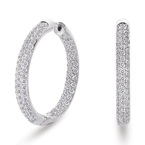LARGE 14KT WHITE GOLD HOOP HANGING EARRINGS. 3D THREE ROW INSIDE OUT CLASSIC DESIGN. DIAMONDS ARE F/G COLOR, VSSI CLARITY 1.96 CARATS. MEASURES 4mm WIDE. WRITTEN APPRAISAL AVAILABLE. COMES IN A PRESENTABLE GIFT BOX.