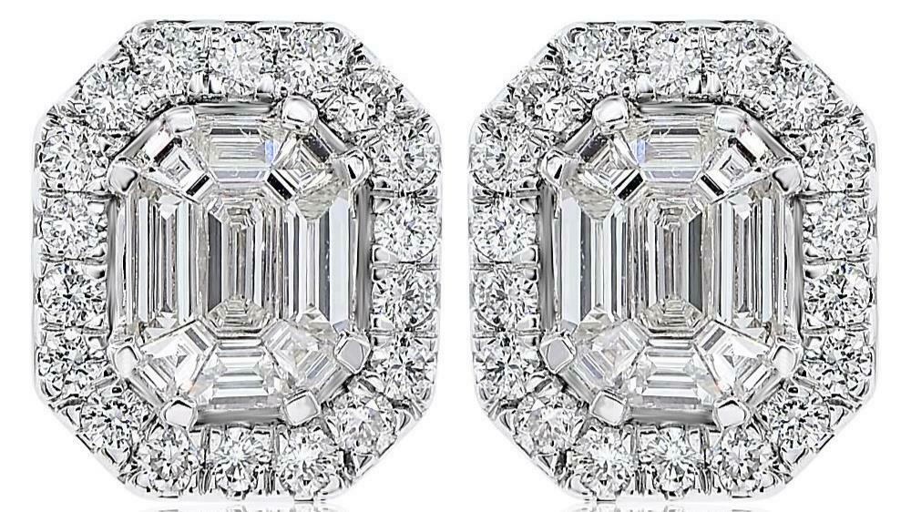 LARGE 14KT WHITEGOLD STUDEARRINGS. 3D OCTAGON HALODESIGN. ROUND AND BAGUETTEDIAMONDS ARE F/G COLOR, VSSI CLARITY 2.07CARATS.WRITTEN APPRAISAL AVAILABLE. COMES IN A PRESENTABLE GIFT BOX.