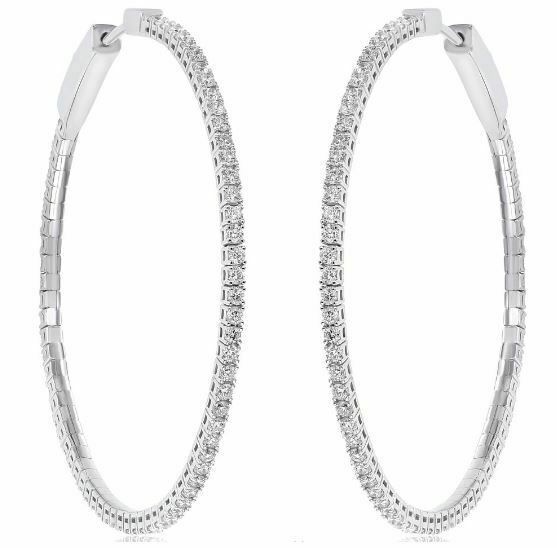 LARGE 18KTWHITE GOLD HOOPEARRINGS. 3D ROUNDINSIDE OUT CLASSICDESIGN. DIAMONDS ARE F/G COLOR, VSSI CLARITY2.08CARATS.WRITTEN APPRAISAL AVAILABLE. COMES IN A PRESENTABLE GIFT BOX.