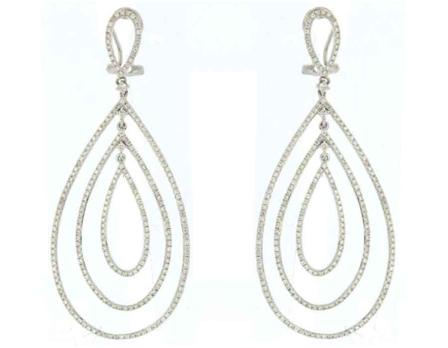 LARGE 14KT WHITE GOLD CLIP ON HANGING EARRINGS. 3D MULTI OPEN TEAR DROP CHANDELIER DESIGN. DIAMONDS ARE F/G COLOR, VSSI CLARITY 2.10 CARATS. WRITTEN APPRAISAL AVAILABLE. COMES IN A PRESENTABLE GIFT BOX.