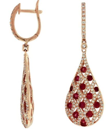 LARGE 14KT ROSE GOLD LEVERBACK HANGING EARRINGS. 3D MULTI ROW INFINITY CRISS CROSS TEAR DROP DESIGN. ROUND DIAMONDS ARE F/G COLOR, VSSI CLARITY .72 CARATS. AAA ROUND RUBIES ARE 1.50 CARATS. WRITTEN APPRAISAL AVAILABLE. COMES IN A PRESENTABLE GIFT BOX.