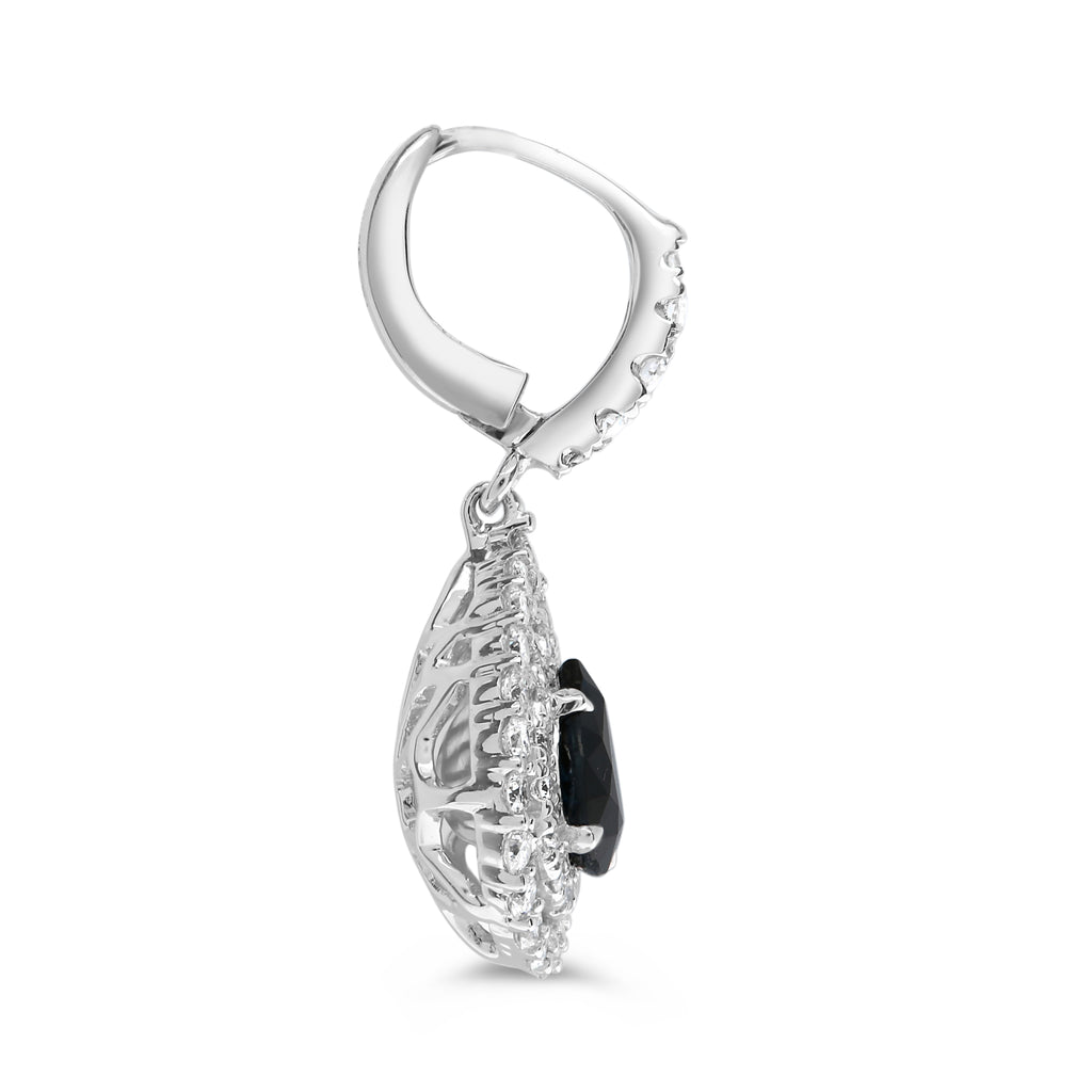 LARGE 18KT WHITE GOLD LEVERBACK HANGING EARRINGS. 3D DOUBLE HALO TEAR DROP DESIGN. ROUND DIAMONDS ARE F/G COLOR, VSSI CLARITY .81 CARATS. AAA PEAR SHAPE SAPPHIRES ARE 1.42 CARATS. MEASURES 23MM X 10MM. WRITTEN APPRAISAL AVAILABLE. COMES IN A PRESENTABLE GIFT BOX.