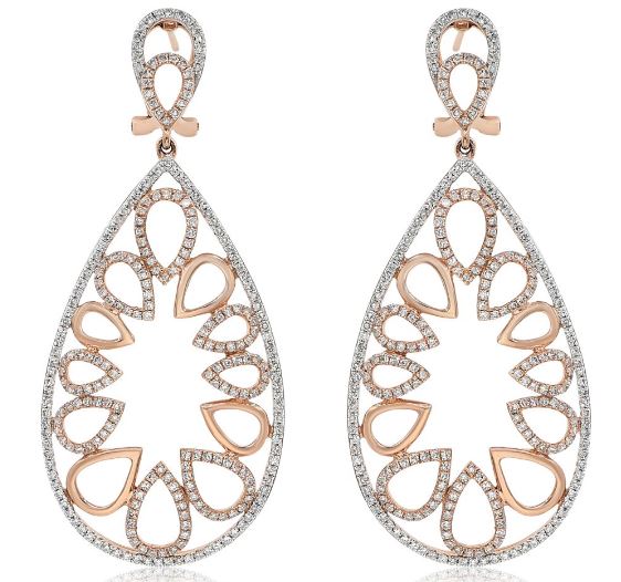 LARGE 14KT ROSE GOLD CLIP ON HANGING EARRINGS. 3D FLOWER TEAR DROP DESIGN. DIAMONDS ARE F/G COLOR, VSSI CLARITY 2.34 CARATS. WRITTEN APPRAISAL AVAILABLE. COMES IN A PRESENTABLE GIFT BOX.
