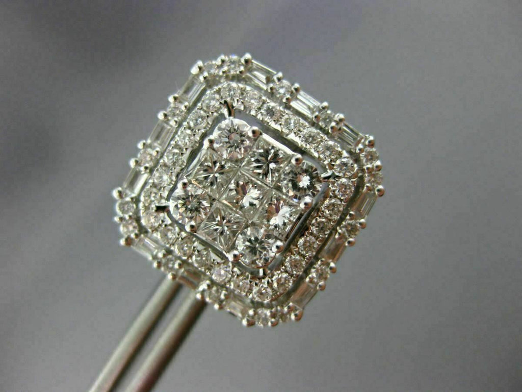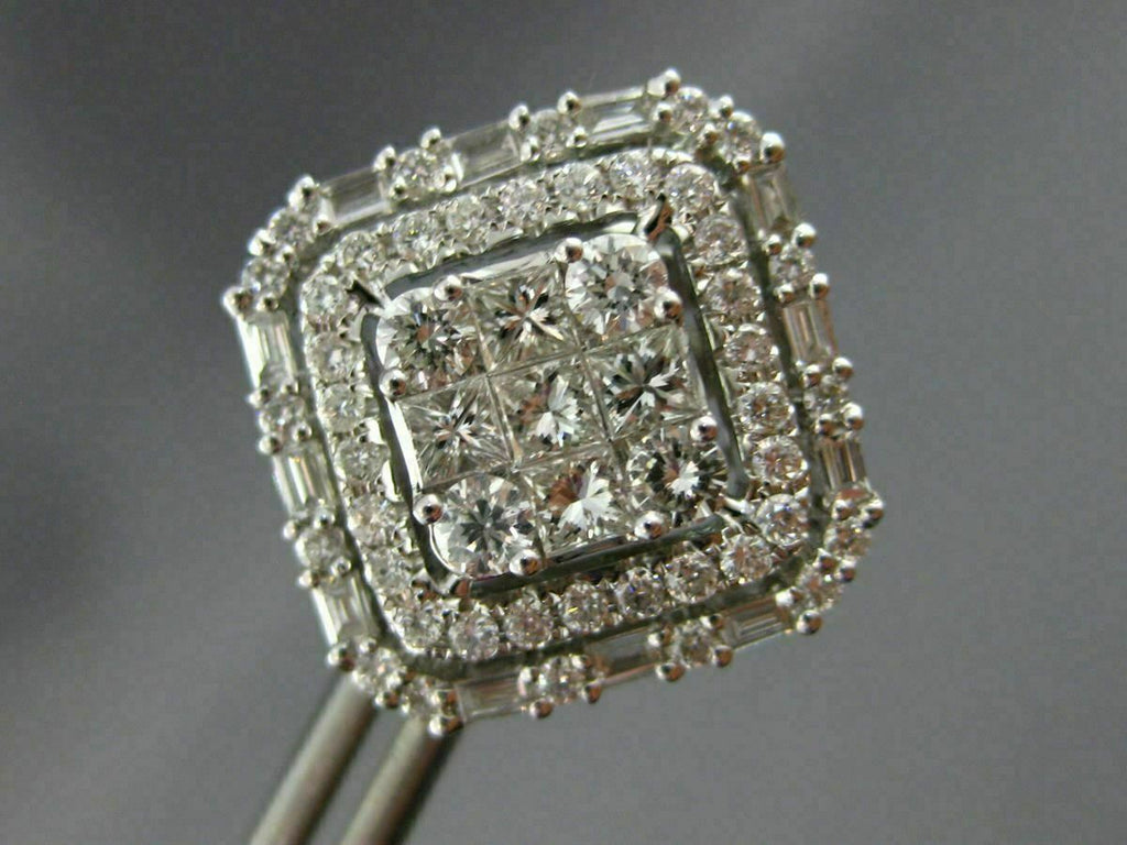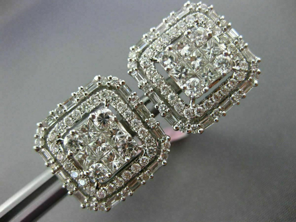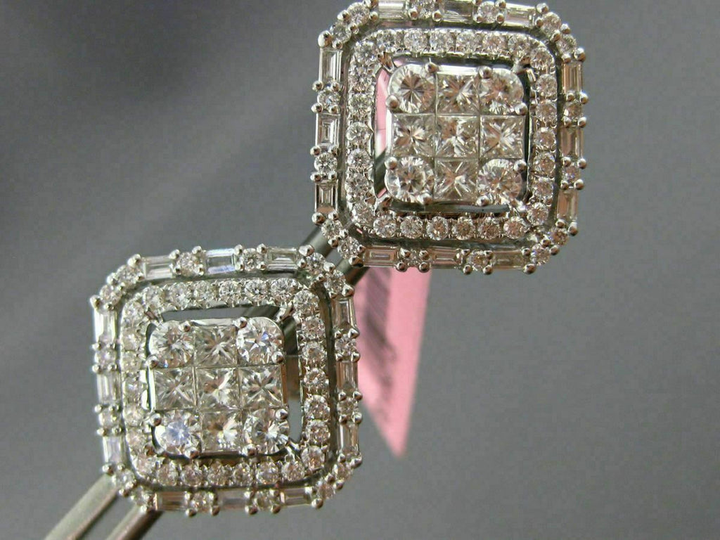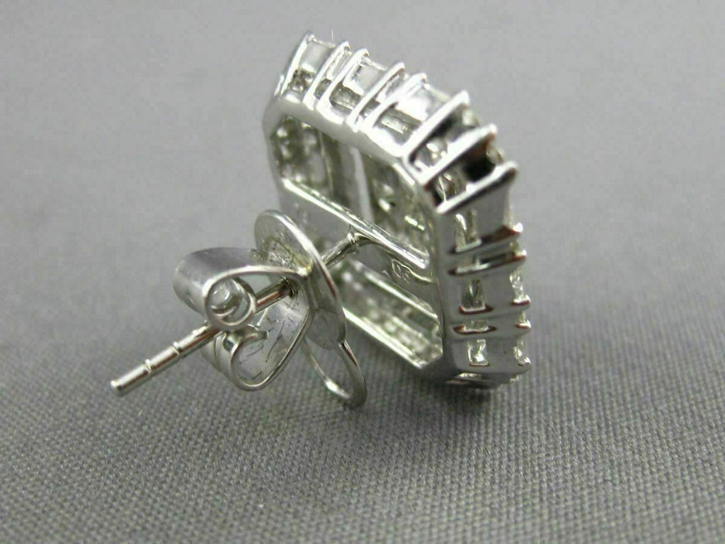 LARGE 18KT WHITE GOLD STUD EARRINGS. 3D SQUARE OCTAGON DESIGN. ROUND BAGUETTE & PRINCESS DIAMONDS ARE F/G COLOR, VSSI CLARITY. ROUND DIAMONDS ARE 1.29 CARATS. BAGUETTE DIAMONDS ARE .34 CARATS. PRINCESS DIAMONDS ARE .77 CARATS. MEASURES 15mm WIDE. WRITTEN APPRAISAL AVAILABLE. COMES IN A PRESENTABLE GIFT BOX.