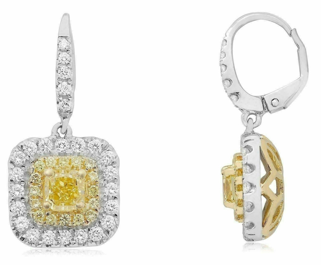 LARGE 18KT WHITE AND YELLOW GOLD LEVERBACK HANGING EARRINGS . 3D CLASSIC DOUBLE HALO DESIGN. DIAMONDS ARE F/G COLOR, VSSI CLARITY .85 CARATS. CUSHION CUT FANCY YELLOW DIAMONDS ARE 1.64 CARATS. MEASURES 26mm X 13mm. WRITTEN APPRAISAL AVAILABLE. COMES IN A PRESENTABLE GIFT BOX