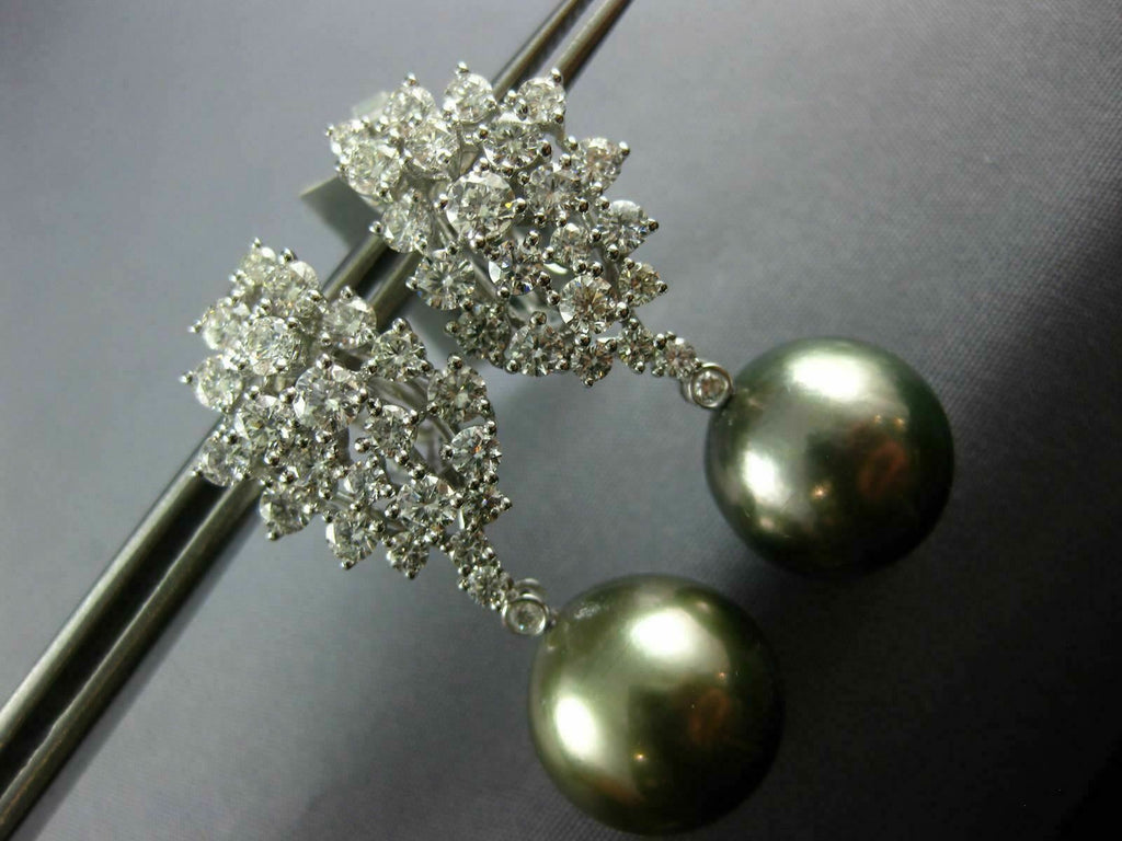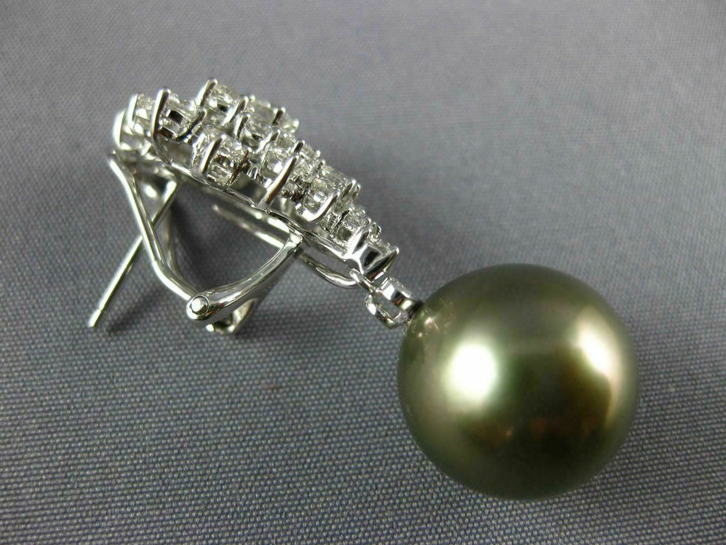 LARGE 18KT WHITEGOLD HANGINGEARRINGS. 3D CLUSTER LEAFDESIGN. DIAMONDS ARE F/G COLOR, VSSI CLARITY 2.70 CARATS. FEATURES AAA TAHITIANPEARLS.MEASURES 37mm X 14mm. WRITTEN APPRAISAL AVAILABLE. COMES IN A PRESENTABLE GIFT BOX.