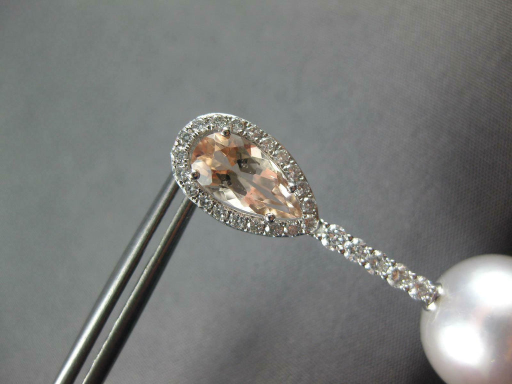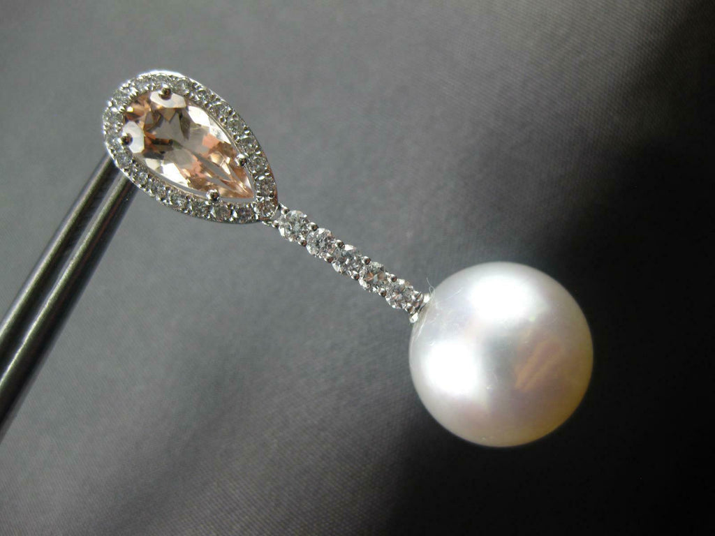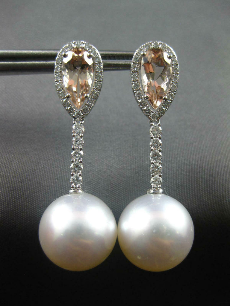 LARGE 18KT WHITE GOLD HANGING EARRINGS. 3D TEAR DROP DESIGN. DIAMONDS ARE F/G COLOR, VSSI CLARITY .76 CARATS. AAA PEAR SHAPE MORGANITES ARE 2.04 CARATS. FEATURES 12.5MM WIDE AAA SOUTH SEA PEARLS. EARRINGS MEASURE 12.5MM X 38MM. WRITTEN APPRAISAL AVAILABLE. COMES IN A PRESENTABLE GIFT BOX.