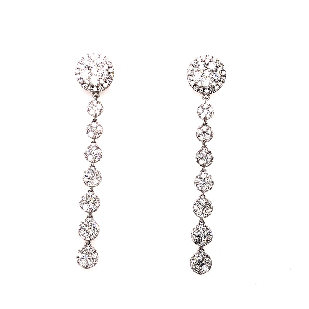 LARGE 18KT WHITE GOLD HANGING EARRINGS. 3D CIRCULAR HALO CLUSTER DESIGN. DIAMONDS ARE F/G COLOR, VSSI CLARITY 2.03 CARATS. WRITTEN APPRAISAL AVAILABLE. COMES IN A PRESENTABLE GIFT BOX.