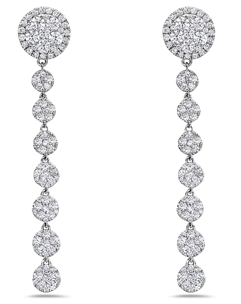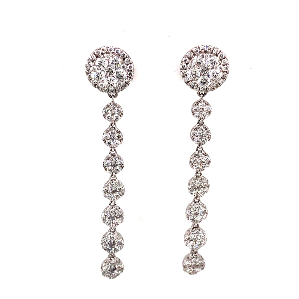 LARGE 2.03CT DIAMOND 18KT WHITE GOLD 3D CIRCULAR HALO CLUSTER HANGING EARRINGS