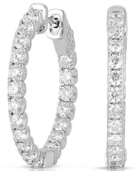 LARGE 14KT WHITE GOLD HOOP HANGING EARRINGS. 3D INSIDE OUT CLASSIC DESIGN. ROUND DIAMONDS ARE F/G COLOR, VSSI CLARITY 2.04 CARATS. WRITTEN APPRAISAL AVAILABLE. COMES IN A PRESENTABLE GIFT BOX.