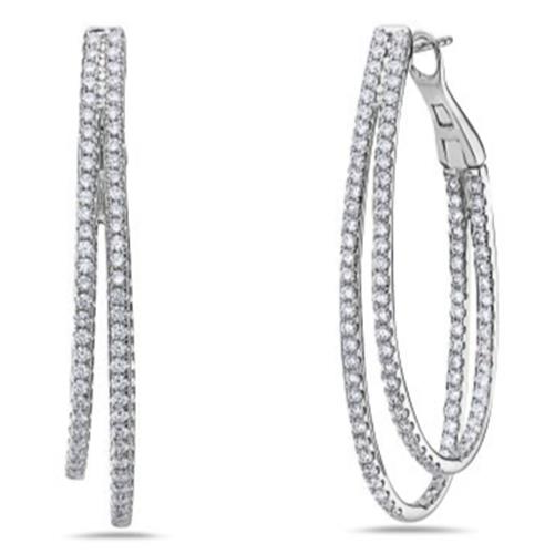 LARGE 18KT WHITE GOLD HOOP HANGING EARRINGS. 3D TWO ROW INSIDE OUT OVAL DESIGN. DIAMONDS ARE F/G COLOR, VSSI CLARITY 2.19 CARATS. WRITTEN APPRAISAL AVAILABLE. COMES IN A PRESENTABLE GIFT BOX.