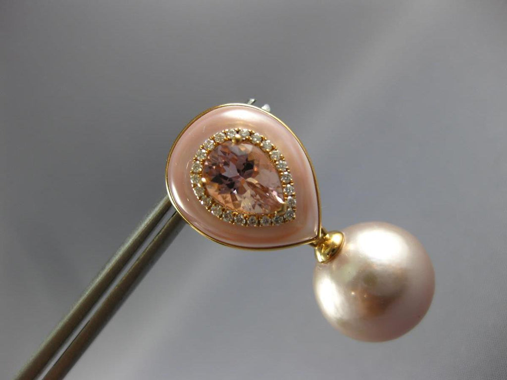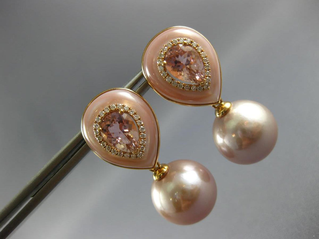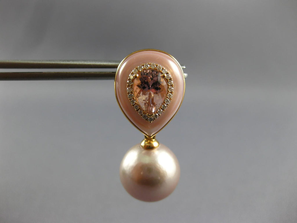 LARGE 18KT ROSE GOLD HANGING EARRINGS. 3D TEAR DROP DESIGN. DIAMONDS ARE F/G COLOR, VSSI CLARITY .22 CARATS. AAA PINK TOURMALINES ARE 2.02 CARATS. FEATURES AAA PINK QUARTZ. FEATURES 12.5mm WIDE AAA PINK SOUTH SEA PEARLS. EARRINGS MEASURES 31mm X 13mm. WRITTEN APPRAISAL AVAILABLE. COMES IN A PRESENTABLE GIFT BOX.