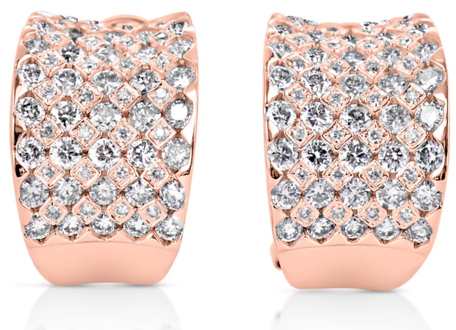 LARGE 14KT ROSE GOLD CLIP ON HANGING EARRINGS. 3D MULTI ROW ROUND AND SQUARE SETTING UMBRELLA DESIGN. DIAMONDS ARE F/G COLOR, VSSI CLARITY 2.28 CARATS. MEASURES 11mm WIDE. WRITTEN APPRAISAL AVAILABLE. COMES IN A PRESENTABLE GIFT BOX.