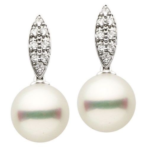 LARGE 18KT WHITE GOLD LEVERBACK HANGING EARRINGS. 3D MARQUISE SHAPE PAVE DESIGN. DIAMONDS ARE F/G COLOR, VSSI CLARITY .22 CARATS. AAA SOUTH SEA PEARLS ARE 9-10MM WIDE. WRITTEN APPRAISAL AVAILABLE. COMES IN A PRESENTABLE GIFT BOX.