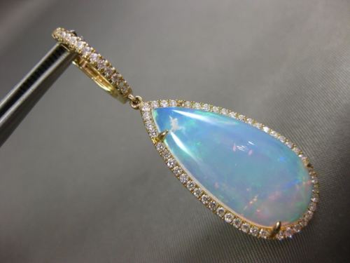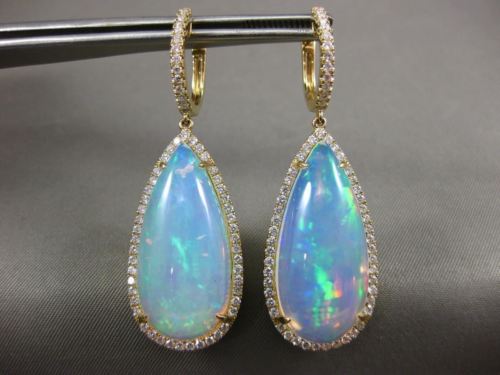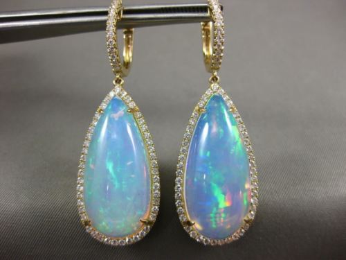 LARGE 23.35CT DIAMOND & AAA OPAL 14K YELLOW GOLD TEAR DROP HALO HANGING EARRINGS