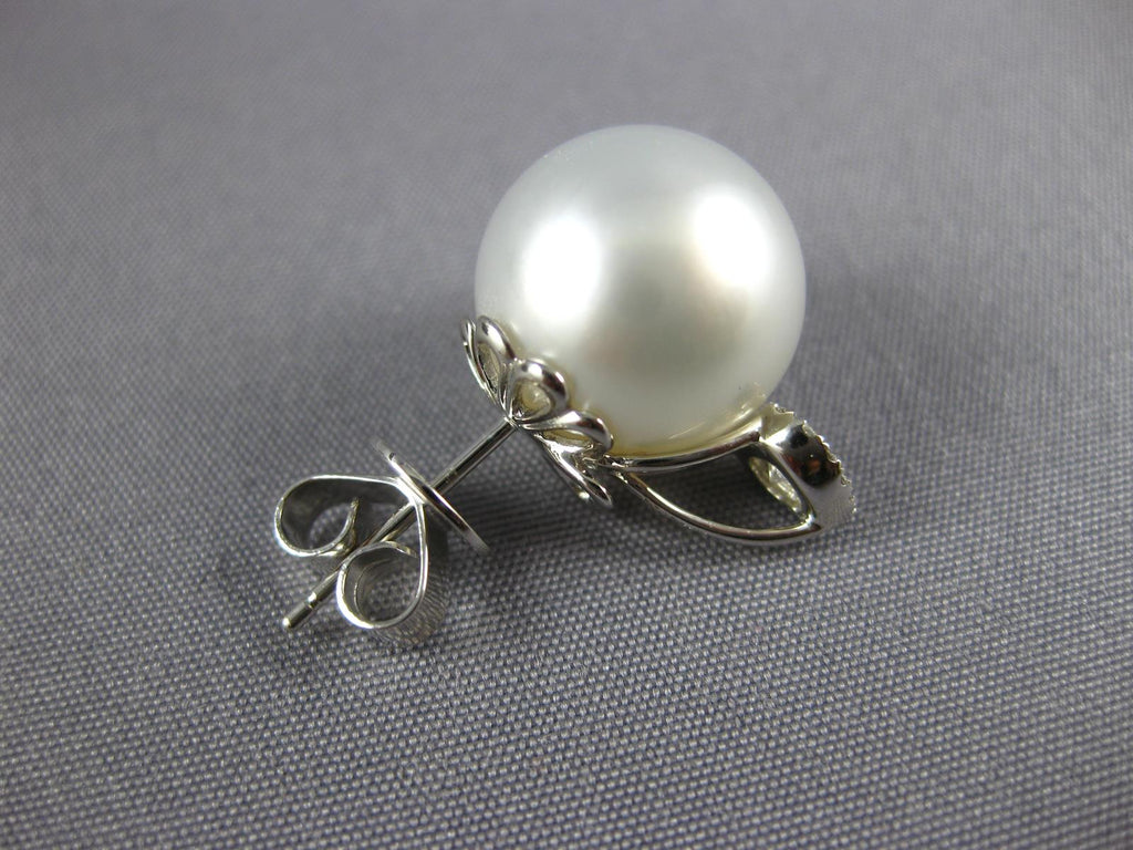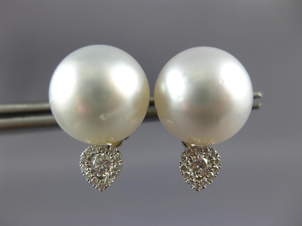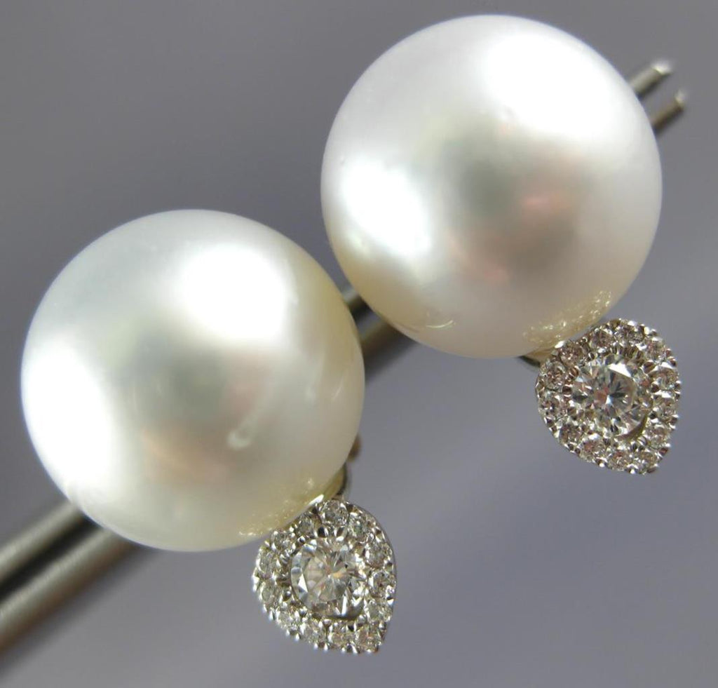 LARGE 18KT WHITE GOLD STUD EARRINGS. 3D TEAR DROP DESIGN. DIAMONDS ARE F/G COLOR, VSSI CLARITY .27 CARATS. FEATURES 12mm WIDE AAA SOUTH SEA PEARLS. EARRINGS MEASURE 17.5mm X 12mm. WRITTEN APPRAISAL AVAILABLE. COMES IN A PRESENTABLE GIFT BOX.