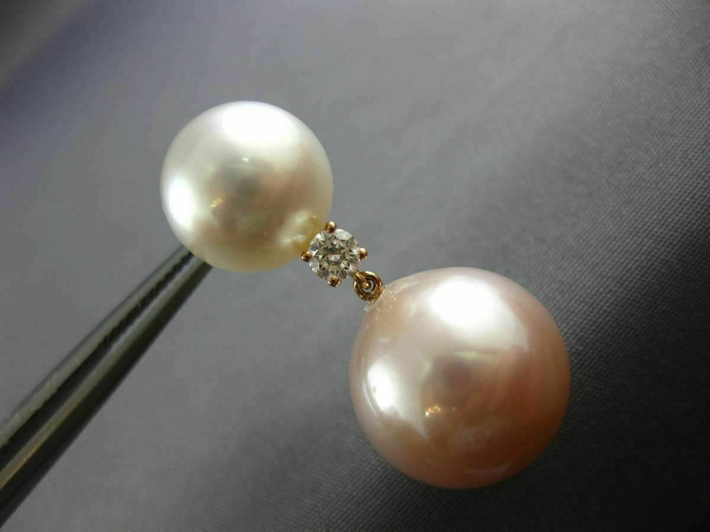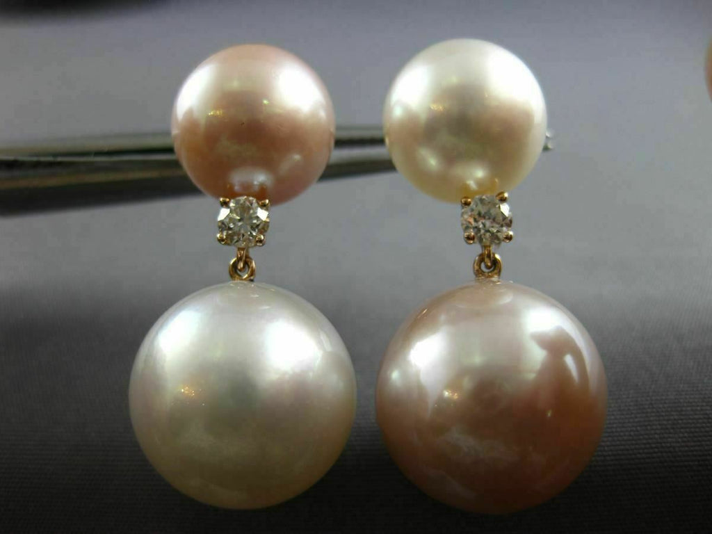 LARGE 18KT ROSE GOLD HANGING EARRINGS. 3D CLASSIC DESIGN. DIAMONDS ARE F/G COLOR, VSSI CLARITY .28 CARATS. AAA PINK AND WHITE SOUTH SEA PEARLS ARE 14MM X 11MM. MEASURES 32mm X 14mm. WRITTEN APPRAISAL AVAILABLE. COMES IN A PRESENTABLE GIFT BOX.