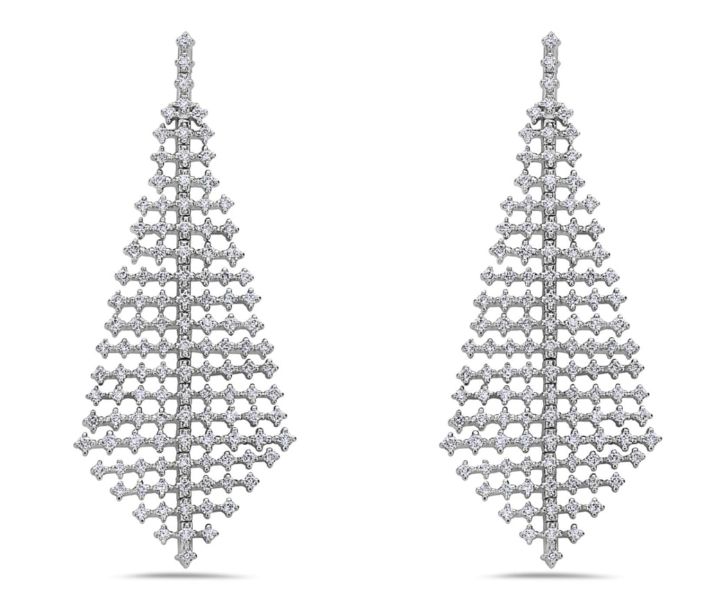 LARGE 18KT WHITE GOLD HANGING EARRINGS. 3D TEAR DROP TRIANGULAR DESIGN. DIAMONDS ARE F/G COLOR, VSSI CLARITY 2.90 CARATS. WRITTEN APPRAISAL AVAILABLE. COMES IN A PRESENTABLE GIFT BOX.