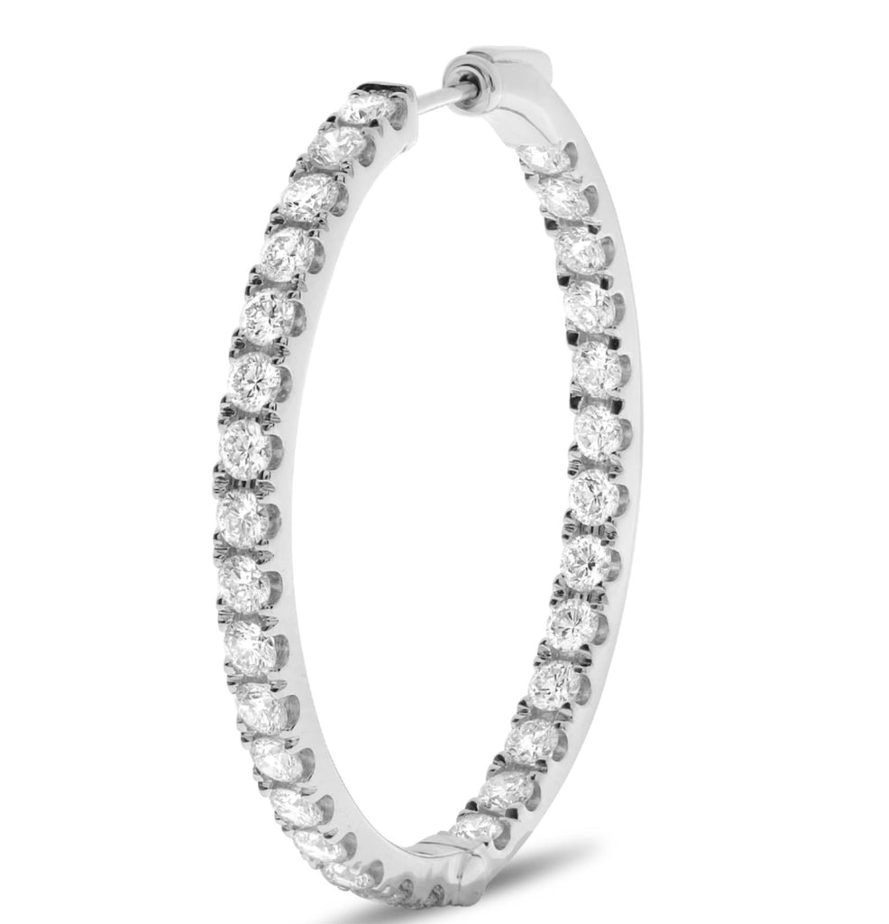 LARGE 14KT WHITE GOLD HOOP HANGING EARRINGS. 3D INSIDE OUT CLASSIC DESIGN. ROUND DIAMONDS ARE F/G COLOR, VSSI CLARITY 3.00 CARATS. MEASURES 1MM WIDE. WRITTEN APPRAISAL AVAILABLE. COMES IN A PRESENTABLE GIFT BOX.
