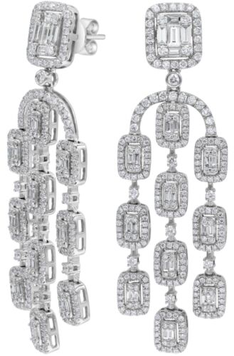LARGE 3.02CT DIAMOND 14K WHITE GOLD ROUND & BAGUETTE CHANDELIER HANGING EARRINGS