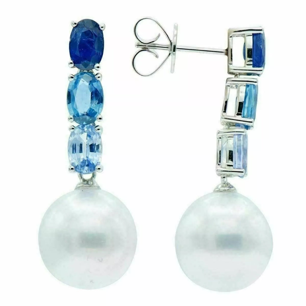 LARGE 3.0CT AAA SOUTH SEA PEARL & SAPPHIRE 18KT WHITE GOLD OVAL HANGING EARRINGS