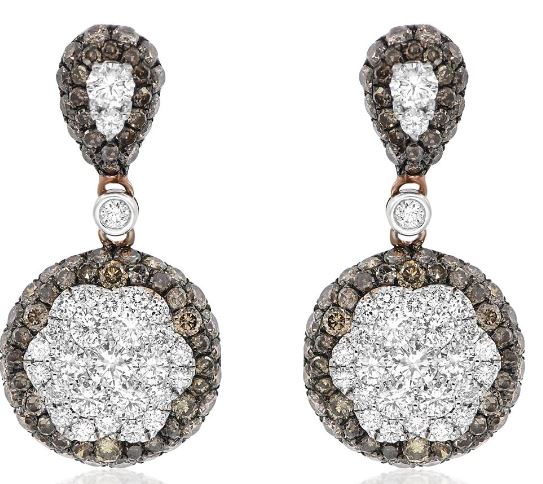 LARGE 14KT ROSE GOLD HANGING EARRINGS. 3D FLOWER CLUSTER TEAR DROP DESIGN. WHITE DIAMONDS ARE F/G COLOR, VSSI CLARITY 1.35 CARATS. MOCHA DIAMONDS ARE 1.89 CARATS. WRITTEN APPRAISAL AVAILABLE. COMES IN A PRESENTABLE GIFT BOX.